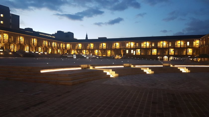 This is interesting with all the lights and the blotchy-looking sky with those clouds hovering overhead.