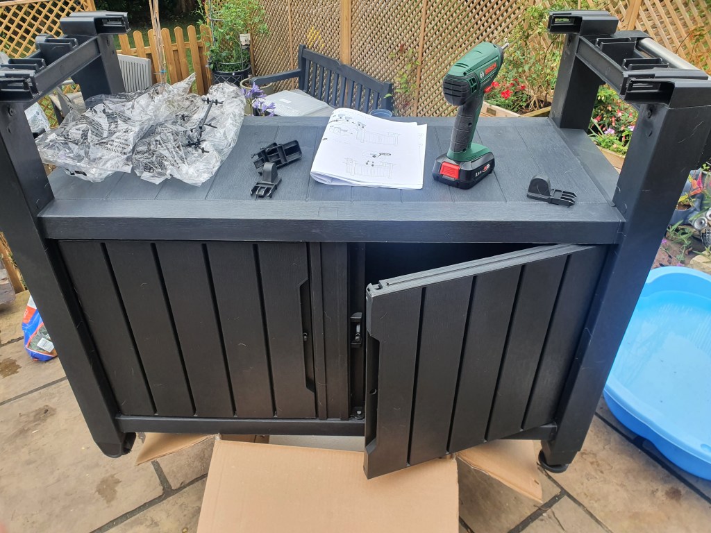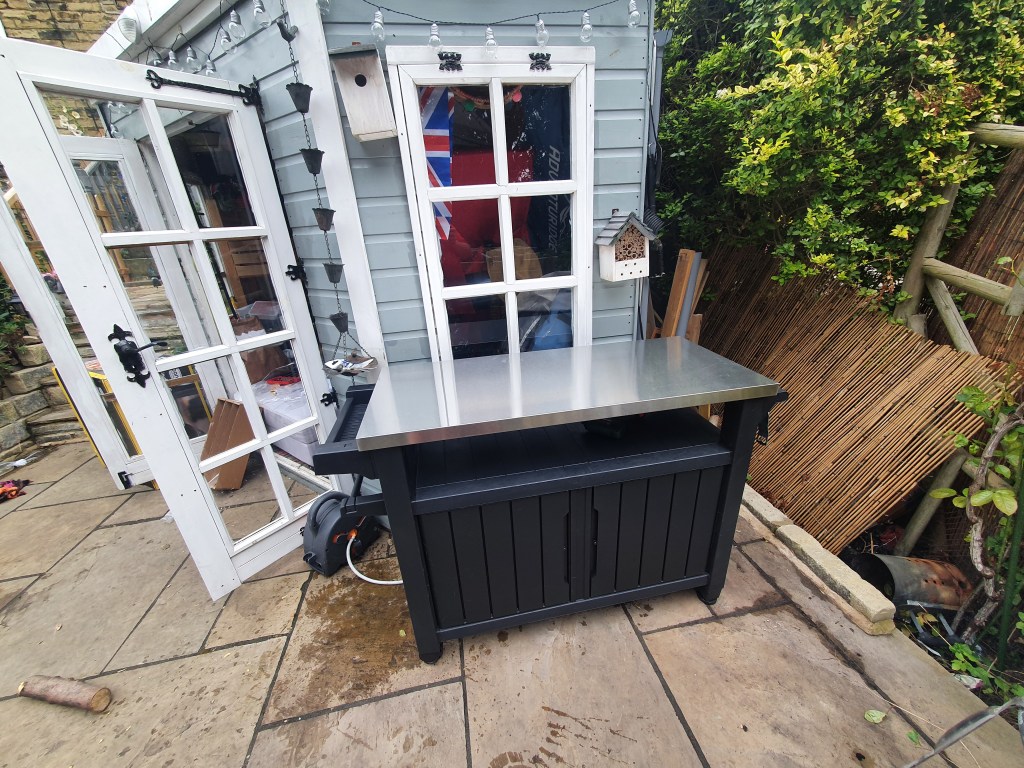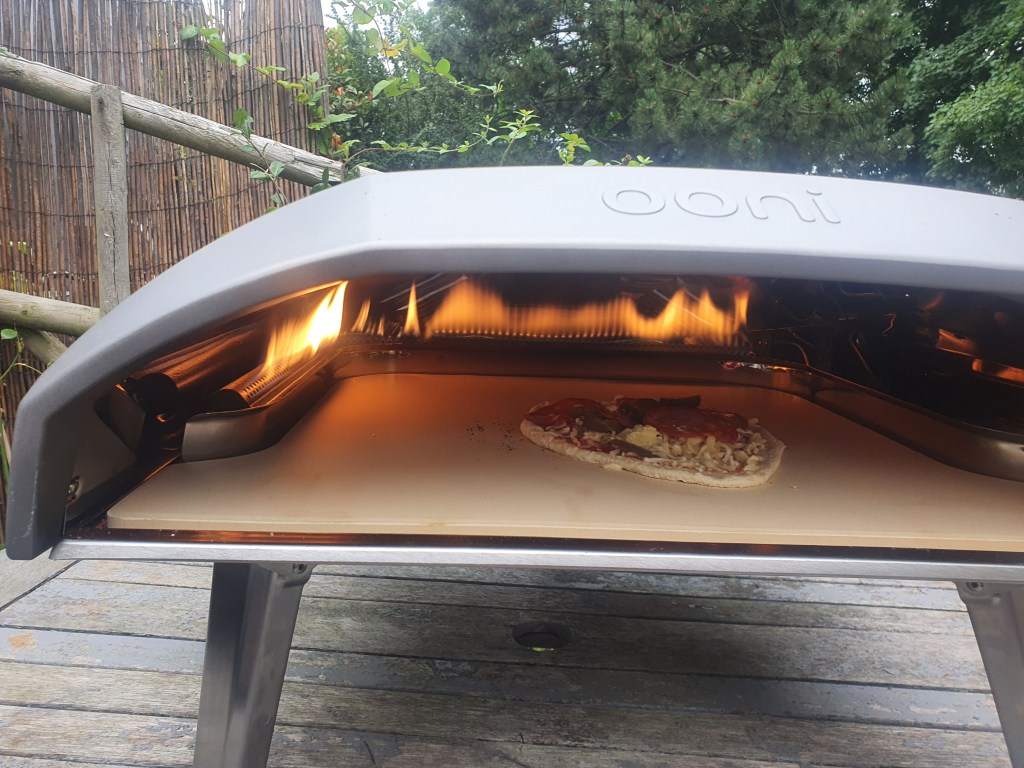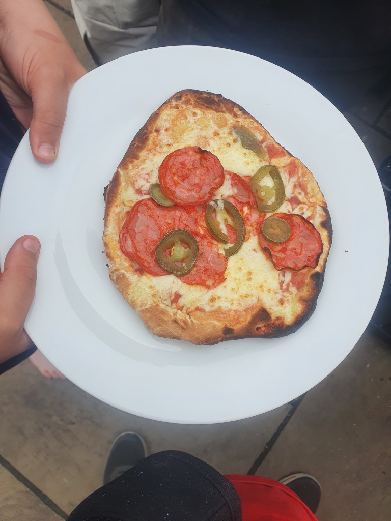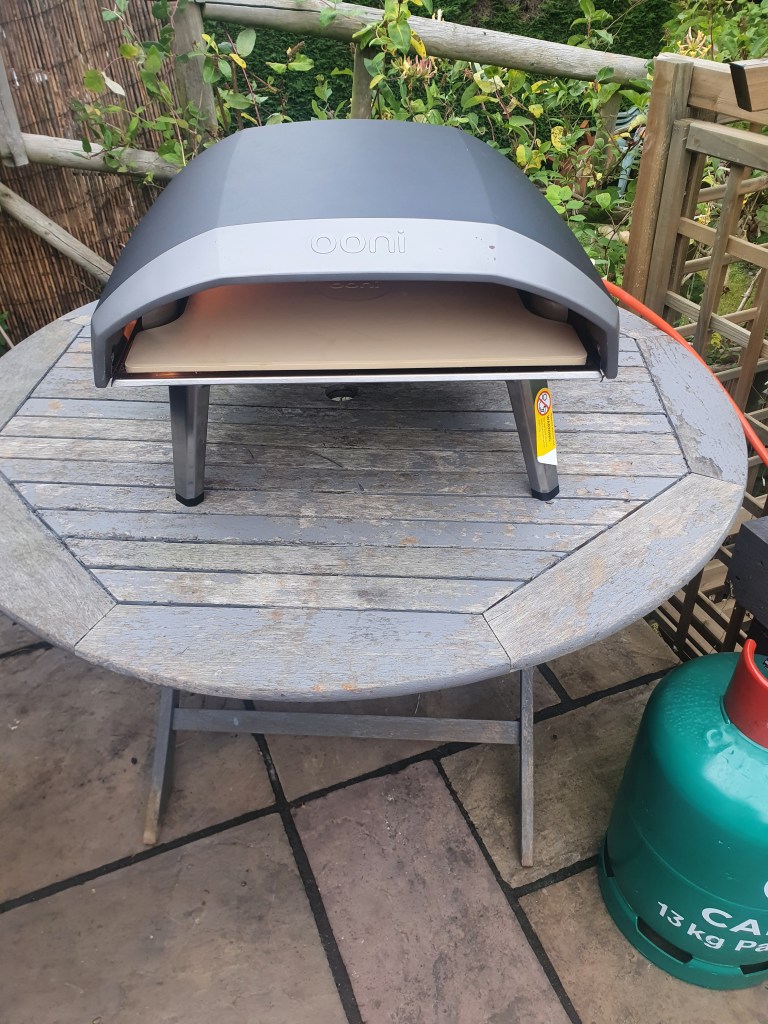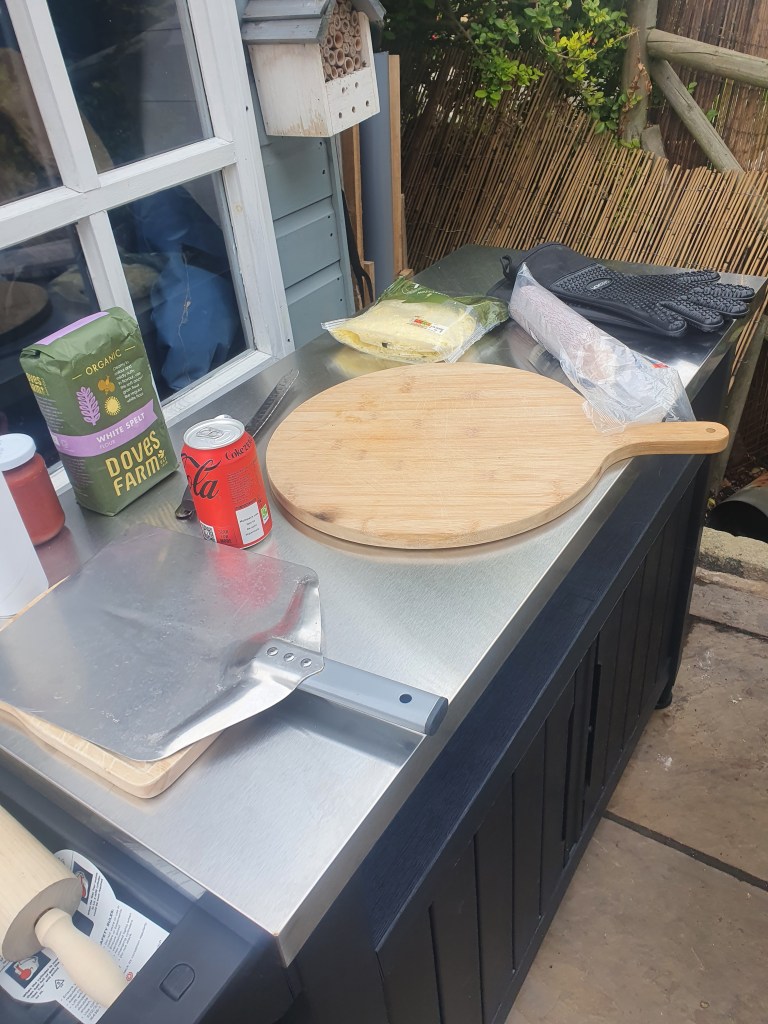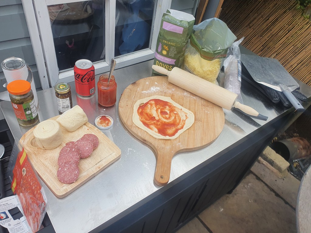 I still need to get a table for it, but I did also pick up a little garden kitchen table this for the prep toop, and with a shop bought dough and a few choice toppings I hooked it up, turned it on, and waited for 30 minutes. It can do a 16 inch pizza apparently, but I am still waiting for the large pizza peel so kept it small to start. Mrs afterwards is away at a spa with her mum and sister and niece this weekend so it was just us boys at home…