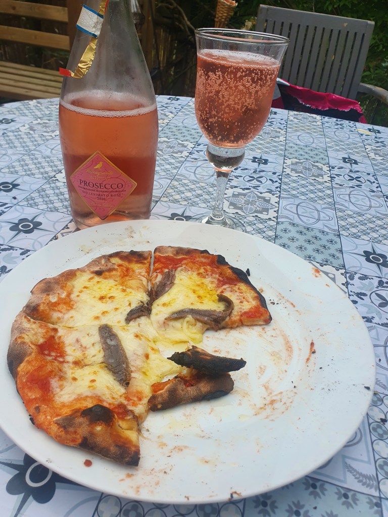 By the time I had fed everyone a few times, including a special one for the dog, it was time for mine I was ready to sit down with a bottle of rose prosecco and my anchovy and Pineapple pizza! But alas there was no pineapple, so it was just anchovies, and my god it was good. Crisp base, delicious toppings and a wood oven taste even though it is a gas oven. They do one with wood but I wasn’t overly fussed by pushing the boat out too much. I was quick and easy.
